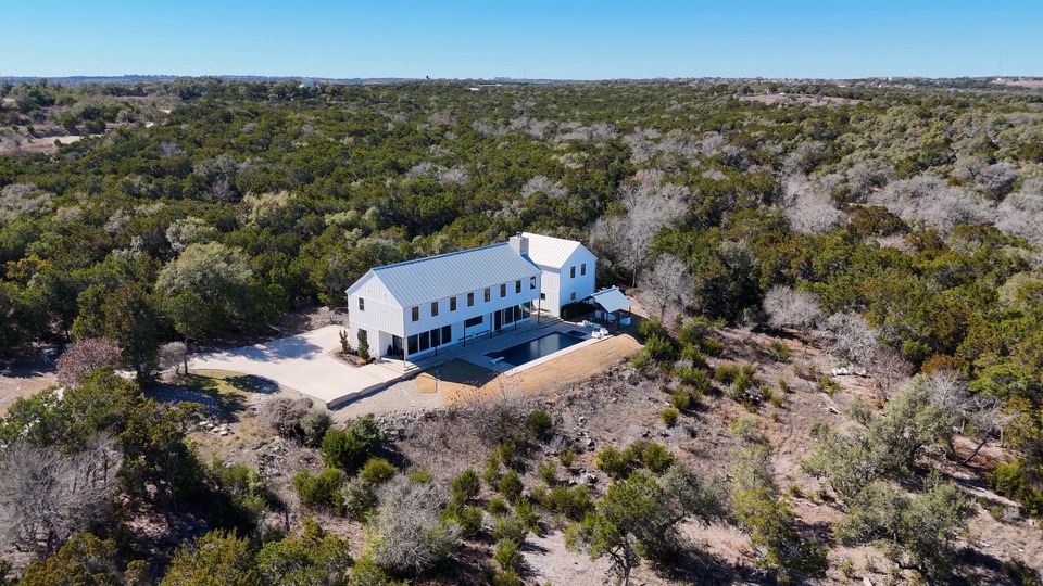Welcome to a rare Hill Country retreat where complete privacy meets modern architectural distinction, just minutes from Austin. Perched on 6 secluded acres at the end of a private road, this extraordinary ranchette offers what is increasingly impossible to find: no neighbors in sight, unobstructed panoramic views, and absolute quiet, all within close proximity to the city. It’s a property defined not just by design, but by its exclusivity. Inside, soaring 30+ foot ceilings and dramatic walls of glass create a breathtaking sense of scale, while the home’s thoughtful orientation prevents direct sunrise or sunset glare, allowing the surrounding vistas to be experienced as living works of art. Polished concrete floors and bespoke finishes deliver a refined yet livable modern aesthetic. At the center of the home, a chef’s kitchen anchors the main living space with a massive island designed for gathering, equally suited for intimate evenings or large-scale entertaining. Each bedroom is a private suite with its own en-suite bath, offering comfort and separation for family or guests. Step outside and the property transforms into a private resort. A sparkling in-ground pool and spa, fully equipped outdoor kitchen, and expansive terraces invite evenings under endless Texas skies. A network of private walking trails winds through the acreage, reinforcing the sense of retreat and serenity. For car enthusiasts, hobbyists, or those seeking exceptional versatility, the custom 2,480-square-foot barn/shop is a standout feature. Complete with a professional-grade lift integrated into the concrete slab, partial kitchen, full bath, and capacity for four vehicles, it offers rare functionality rarely found in residential properties. Dual EV charging stations further enhance the modern lifestyle appeal. Perhaps most remarkable is the balance this property achieves: total privacy and security, yet remarkably close to downtown Austin, approximately just 15 minutes away. Zoned to exemplary schools and positioned in one of the region’s most desirable corridors, this offering is truly uncommon. Private. Secure. Architecturally striking. And extraordinarily rare. This is more than a home, it is a secluded Hill Country estate designed for those who value space, serenity, and proximity.